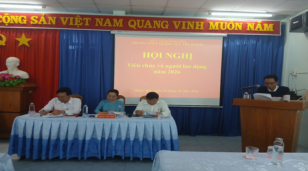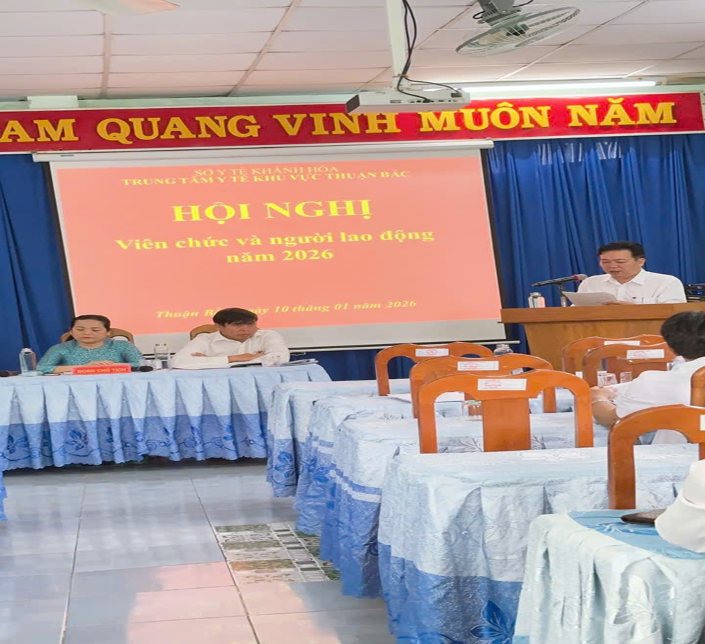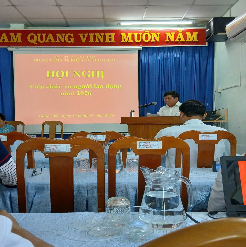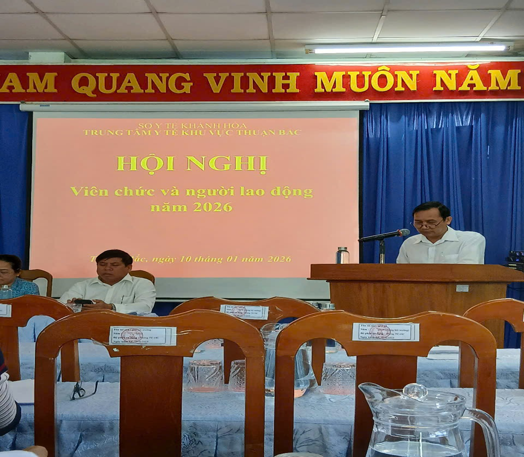 Sáng ngày 10/01/2026 Trong không khí phấn khởi chào mừng năm mới và thực hiện tốt các nhiệm vụ trọng tâm của ngành Y tế, Trung tâm Y tế khu vực Thuận Bắc long trọng tổ chức Hội nghị CBVC & NLĐ năm 2026 mục đích đánh giá kết quả hoạt động năm 2025, đề ra phương hướng nhiệm vụ năm 2026, thảo luận các giải pháp nâng cao hiệu quả công tác chuyên môn và chăm lo quyền lợi, đời sống của cán bộ, viên chức và người lao động trong toàn đơn vị.